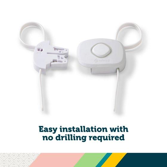 It installs easily with no drilling required. The adjustable straps let you get a customized fit for cabinets with hardware up to 8 inches apart and can be used on cabinets with either knobs or handle pulls. For periods of non-use, this cabinet lock hangs conveniently out of the way, but stays close for when it’s needed again.