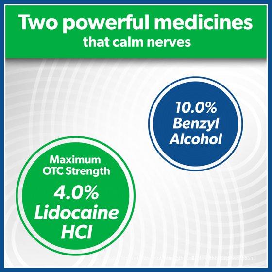 - QUALITY ACTIVE INGREDIENTS WITH NO PRESCRIPTON: Benzyl Alcohol numbs nerves fast. A second anesthetic, Lidocaine, is at the maximum strength you can buy without a prescription. That's two powerful medicines that provide targeted relief and calms nerves for hours