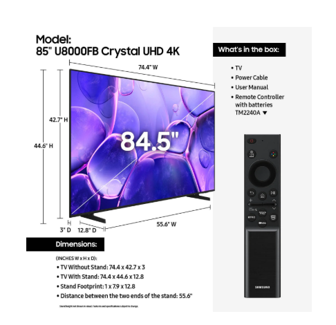 Samsung 85” Class Crystal UHD U8000FB 4K Smart TV 2025 - UN85U8000FBXZA