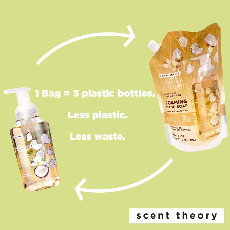 - Foaming hand soap pouch refills Scent Theory 11-ounce-soap dispenser up to 3 times
