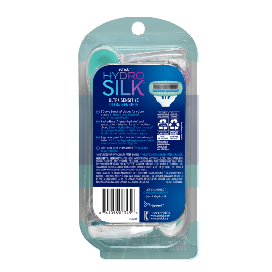 Get expert-level care at home with our women’s disposable razor that’s designed to handle even your most sensitive areas! Our Hydro Silk 5 blade Ultra Sensitive Disposable Razor is dermatologist tested and has 5 Curve-Sensing blades with skin-protection coating and unique skin guards. They provide ultimate closeness and follow the natural contours of your body, giving you control over your shave. Formulated with aloe and chamomile, these disposable razors for women feature our hypoallergenic Hydra-Boost serum that hydrates* and protects skin from irritation for our smoothest glide ever. *Moisturizes for up to 2 hours after shaving
