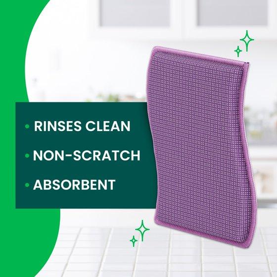 - Scrubbing surface rinses clean with water. The reverse side of the scrubber is a soft absorbent cloth that is great for wiping up spills!
