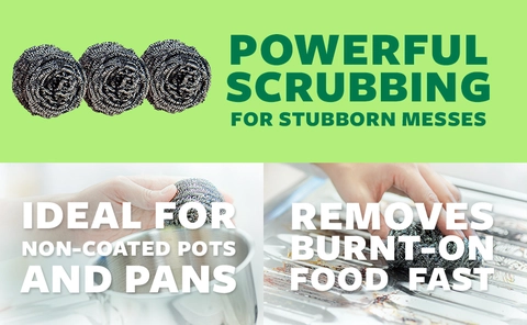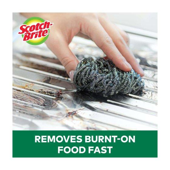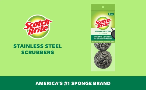 - THREE SCRUBBERS: One package of Scotch-Brite Stainless Steel Scrubbers; one pack contains three pot scrubbers