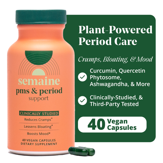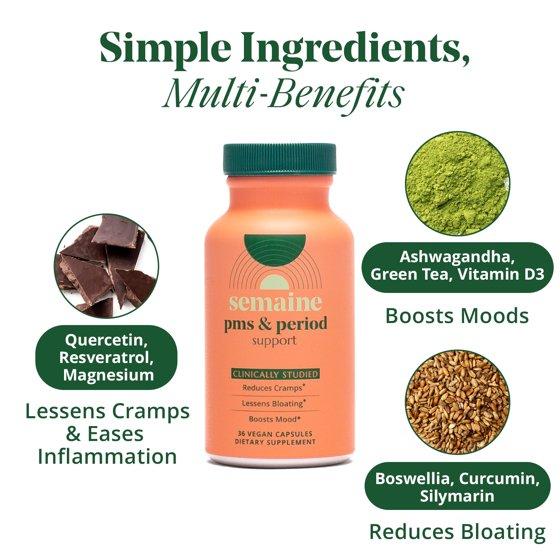 Semaine PMS & Period Support, 12 Count, is clinically studied for use before and during your period, not throughout the month. Doctor-formulated with 9 antioxidant-rich plants and minerals to help with cramps, bloating, and mood swings. Includes Ashwagandha, Green Tea Catechins (caffeine-free), and Vitamin D3 to uplift mood. Contains Resveratrol, magnesium, and quercetin to ease cramping discomfort, plus Boswellia, curcumin, and silymarin to relieve bloating. Made in an FDA-regulated facility using high-quality, lab-tested ingredients.*