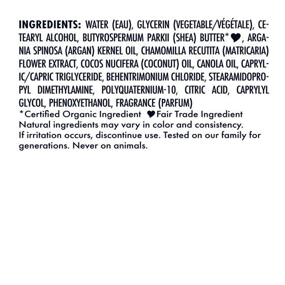 Water, Glycerin (Vegetable/Vegetale), Cetearyl Alcohol, Butyrospermum Parkii (Shea) Butter (Certified Organic Ingredient) (Fair Trade Ingredient), Argania Spinosa (Argan) Kernel Oil, Chamomilla Recutita (Matricaria) Flower Extract, Cocos Nucifera (Coconut) Oil, Canola Oil, Caprylic/Capric Triglyceride, Behentrimonium Chloride, Stearamidopropyl Dimethylamine, Polyquaternium-10, Citric Acid, Caprylyl Glycol, Phenoxyethanol, Fragrance (Parfum).