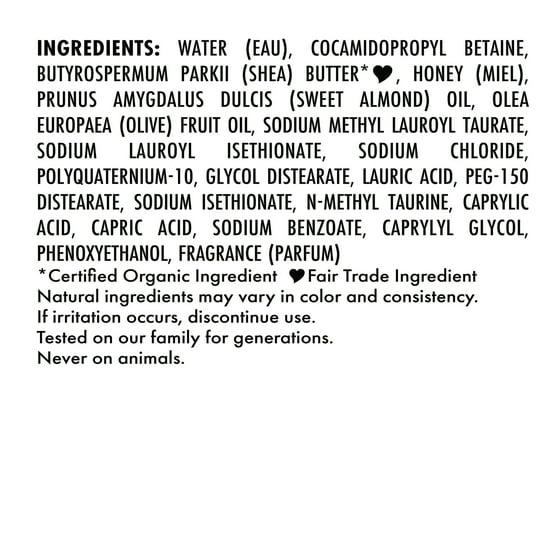 WATER (EAU), COCAMIDOPROPYL BETAINE, BUTYROSPERMUM PARKII (SHEA) BUTTER, HONEY (MIEL), PRUNUS AMYGDALUS DULCIS (SWEET ALMOND) OIL, OLEA EUROPAEA (OLIVE) FRUIT OIL, SODIUM METHYL LAUROYL TAURATE, SODIUM LAUROYL ISETHIONATE, SODIUM CHLORIDE, POLYQUATERNIUM-10, GLYCOL DISTEARATE, LAURIC ACID, PEG-150 DISTEARATE, SODIUM ISETHIONATE, N-METHYL TAURINE, CAPRYLIC ACID, CAPRIC ACID, SODIUM BENZOATE, CAPRYLYL GLYCOL, PHENOXYETHANOL, FRAGRANCE (PARFUM)