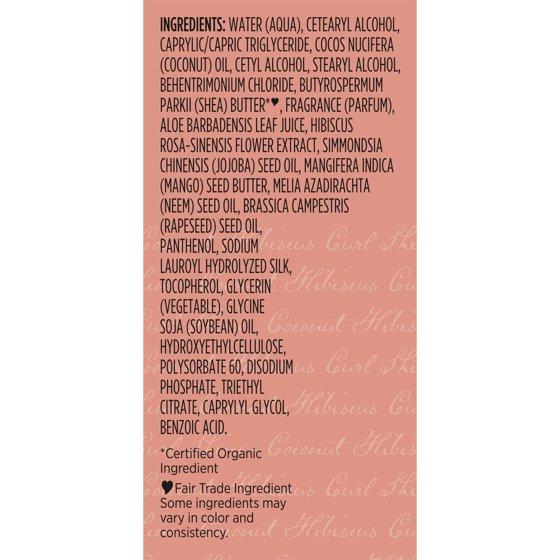 Water (Eau), Cetearyl Alcohol, Caprylic/Capric Triglyceride, Cocos Nucifera (Coconut) Oil, Cetyl Alcohol, Stearyl Alcohol, Behentrimonium Chloride, Butyrospermum Parkii (Shea) Butter*(a), Fragrance (Parfum), Aloe Barbadensis Leaf Juice, Hibiscus Rosa-Sinensis Flower Extract, Simmondsia Chinensis (Jojoba) Seed Oil, Mangifera Indica (Mango) Seed Butter, Melia Azadirachta (Neem) Seed Oil, Brassica Campestris (Rapeseed) Seed Oil, Panthenol, Sodium Lauroyl Hydrolyzed Silk, Tocopherol, Glycerin (Vegetable), Glycine Soja (Soybean) Oil, Hydroxyethylcellulose, Polysorbate 60, Disodium Phosphate, Triethyl Citrate, Caprylyl Glycol, Benzoic Acid. * Certified Organic Ingredient. (a) Fair Trade Ingredient.