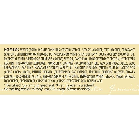 Water, Ricinus Communis (Castor) Seed Oil, Stearyl Alcohol, Cetyl Alcohol, Behentrimonium Chloride, Butyrospermum Parkii (Shea) Butter*ª´, Cocos Nucifera (Coconut) Oil, Dicaprylyl Ether, Panthenol, Hydrolyzed Rice Protein, Simmondsia Chinensis (Jojoba) Seed Oil, Hydrolyzed Keratin, Hydroxyethylcellulose, Adansonia Digitata (Baobab) Seed Oil, Glycerin (Vegetable), Aloe Barbadensis Leaf Juice, Macadamia Ternifolia Seed Oil, Mauritia Flexuosa Fruit (Buriti) Oil, Vinegar, Mentha Piperita (Peppermint) Leaf Extract, Trifolium Pratense (Clover) Flower Extract, Niacin, Tocopheryl Acetate, Hydrolyzed Vegetable Protein PG-Propyl Silanetriol, Yeast Extract, Caprylyl Glycol, Caprylhydroxamic Acid, Fragrance (Essential Oil Blend) *Certified Organic Ingredient ª´Fair Trade Ingredient
