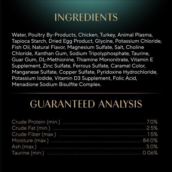 Water, Poultry By-Products, Chicken, Turkey, Animal Plasma, Tapioca Starch, Dried Egg Product, Glycine, Potassium Chloride, Fish Oil, Natural Flavor, Magnesium Sulfate, Salt, Choline Chloride, Xanthan Gum, Sodium Tripolyphosphate, Taurine, Guar Gum, DL-Methionine, Thiamine Mononitrate, Vitamin E Supplement, Zinc Sulfate, Ferrous Sulfate, Caramel Color, Manganese Sulfate, Copper Sulfate, Pyridoxine Hydrochloride, Potassium Iodide, Vitamin D3 Supplement, Folic Acid, Menadione Sodium Bisulfite Complex.