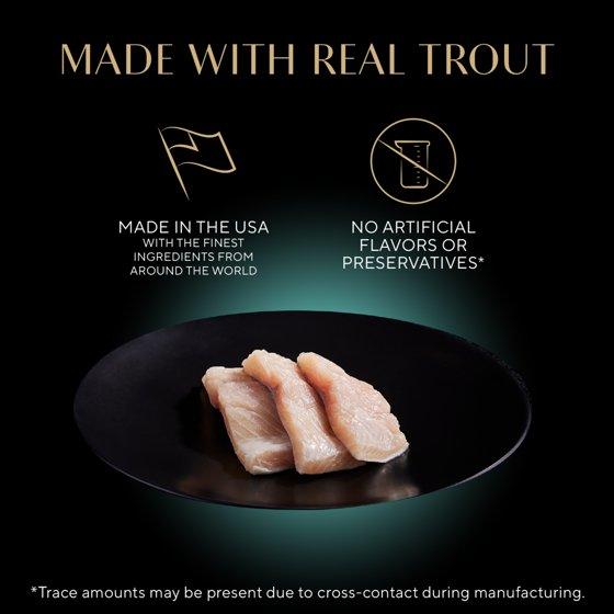 Water, Trout, Chicken, Poultry By-Products, Animal Plasma, Tapioca Starch, Dried Egg Product, Glycine, Potassium Chloride, Fish Oil, Natural Flavor, Magnesium Sulfate, Salt, Sodium Tripolyphosphate, Choline Chloride, Xanthan Gum, Calcium Carbonate, Taurine, Guar Gum, DL-Methionine, Thiamine Mononitrate, Vitamin E Supplement, Zinc Sulfate, Ferrous Sulfate, Manganese Sulfate, Copper Sulfate, Pyridoxine Hydrochloride, Potassium Iodide, Vitamin D3 Supplement, Folic Acid, Menadione Sodium Bisulfite Complex.