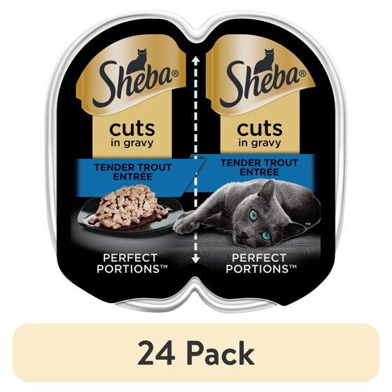- Contain(Pack of 24) 2.6 oz. twin pack trays (48 servings total) of SHEBA Wet Cat Food Cuts in Gravy PERFECT PORTIONS, Tender Trout Entree