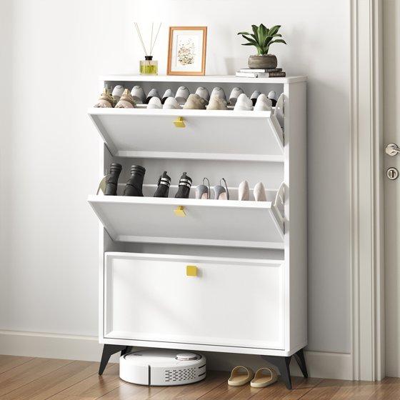 Shoe Cabinet White with 3 Flip-top Drawers and Gold Handles, Hidden Shoe Storage Narrow Shoe Closet for Entryway Slim, White