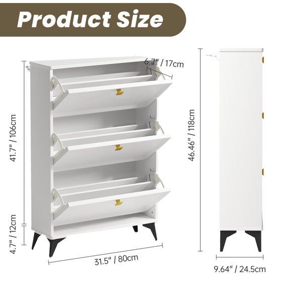 shoe cabinet provides you with enough storage space. 3 spacious flip drawers can hold up to 27 to 36 pairs of shoes to keep them organized and protected from dust. The panel in each compartment can be adjusted or removed to hold different sizes of shoes.