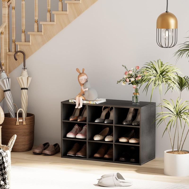 Shoe Storage Bench, Cubby Shoe Rack with 9 Cubbies, 3-Tier Wood Shoe Rack Organizer, Shoe Organizer Cabinet for Entryway, Hallway, Closet and Garage, Black