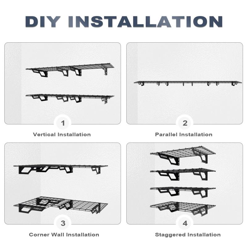 - QUICK ONE-PERSON ASSEMBLY: No extra hands required! Our intuitive design allows for a hassle-free, one-person installation. Complete with a durable, rust-resistant finish and all necessary hardware, these wall mounted garage shelves are ready