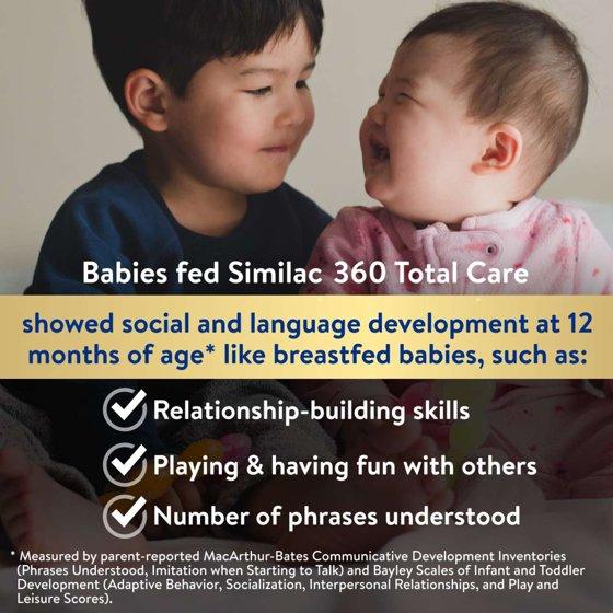 Similac 360 Total Care* infant formula has an exclusive blend of 5 HMO prebiotics structurally identical to 5 of those found in breast milk. Our infant formula is designed to help support the immune system, brain development, and digestive health. Similac is the #1 brand fed in hospitals. Ingredients in Similac 360 Total Care have no artificial growth hormones† and are non-GMO.‡ * Not for infants or children with galactosemia. † Milk ingredients are derived from milk of non-rbST-treated cows, which is not different from milk of rbST-treated cows. ‡ Ingredients not genetically engineered. § In a clinical study of 607 enrolled infants fed Similac 360 Total Care, a formula without HMOs, or breast milk through 12 months of age with all groups being introduced to complementary foods around 6 months of age. ¶ Offers may vary. Additional terms, conditions, and restrictions may apply.