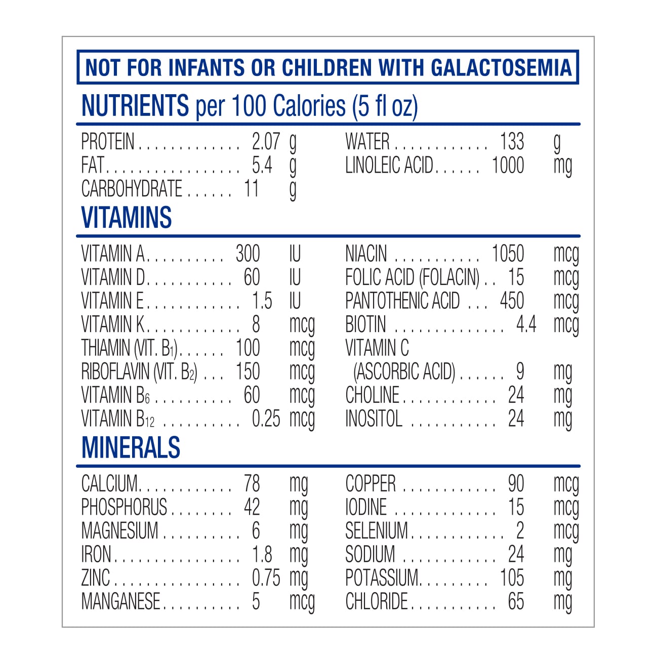 Water, Nonfat Milk, Lactose, High Oleic Safflower Ol, Soy Oil, Coconut Oil, Whey Protein Concentrate; Less than 0.5% of: Human Milk Oligosaccharides (a) (2'-Fucosyllactose, Lacto-N-Tetraose, 3-Fucosyllactose, 6'-Sialyllactose 3-Sialyllactose), Schizochytrium SP, Oil (b), M. Alpina Oil, (c) Beta-Carotene, Luten, Ascorbic Acid, Soy Lecithin, Monoglycerides, Potassium Citrate, Calcium Carbonate, Potassium Chloride, Carrageenan, Ferrous Sulfate, Magnesium Chloride, Choline Chloride, Choline Bitartrate, Taurine, Inositol, Calcium Phosphate, Zinc Sulfate, Potassium Phosphate, D-Alpha-Tocopheryl Acetate, Niacinamide, Calcium Pantothenate, L-Carnitine, Vitamin A Palmitate, Copper Sulfate, Thiamne Hydrochloride, Riboflavin, Pyridoxine Hydrochloride, Folic Acid, Manganese Sulfate, Phylloquinone, Biotin, Sodium Selenate, Vitamin D3, Vitamin B12, Salt, Potassium Iodide, Potassium Hydroxide, and Nucleotides (Adenosine 5'-Monophosphate, Cytidine 5-Monophosphate, Disodium Guanosine 5'-Monophosphate, Disodium Uridine 5-Monophosphate). (a) HMO, Not from Human Milk. (b) Source of DHA. (c) Source of ARA.