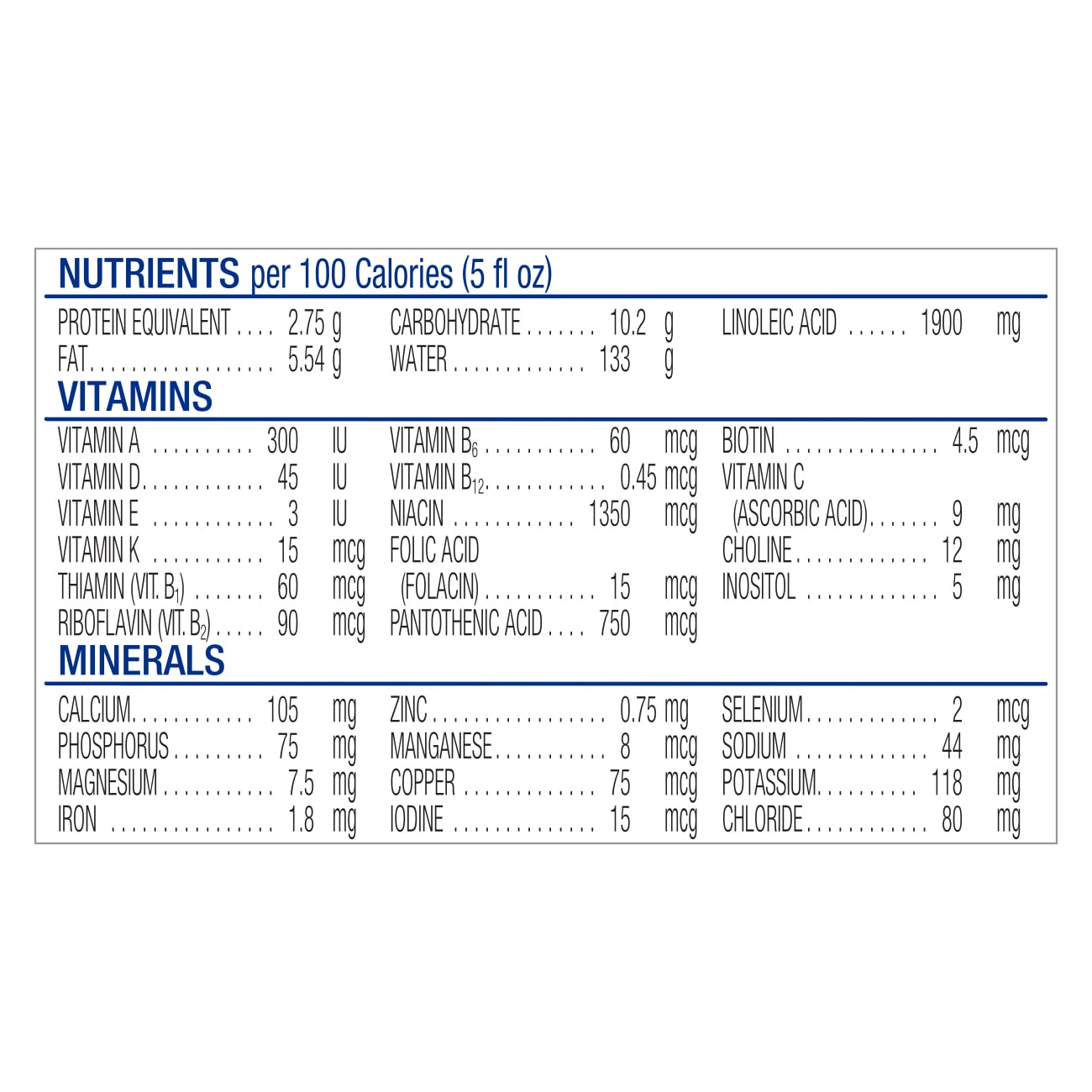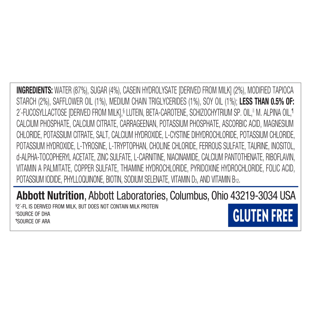 WATER (87%), SUGAR (4%), CASEIN HYDROLYSATE [DERIVED FROM MILK] (2%), MODIFIED TAPIOCA STARCH (2%), SAFFLOWER OIL (1%), MEDIUM CHAIN TRIGLYCERIDES (1%), SOY OIL (1%); LESS THAN 0.5% OF: 2′-FUCOSYLLACTOSE [DERIVED FROM MILK]*, LUTEIN, BETA-CAROTENE, SCHIZOCHYTRIUM SP. OIL†, M. ALPINA OIL‡, CALCIUM PHOSPHATE, CALCIUM CITRATE, CARRAGEENAN, POTASSIUM PHOSPHATE, ASCORBIC ACID, MAGNESIUM CHLORIDE, POTASSIUM CITRATE, SALT, CALCIUM HYDROXIDE, L-CYSTINE DIHYDROCHLORIDE, POTASSIUM CHLORIDE, POTASSIUM HYDROXIDE, L-TYROSINE, L-TRYPTOPHAN, CHOLINE CHLORIDE, FERROUS SULFATE, TAURINE, INOSITOL, d-ALPHA-TOCOPHERYL ACETATE, ZINC SULFATE, L-CARNITINE, NIACINAMIDE, CALCIUM PANTOTHENATE, RIBOFLAVIN, VITAMIN A PALMITATE, COPPER SULFATE, THIAMINE HYDROCHLORIDE, PYRIDOXINE HYDROCHLORIDE, FOLIC ACID, POTASSIUM IODIDE, PHYLLOQUINONE, BIOTIN, SODIUM SELENATE, VITAMIN D3, AND VITAMIN B12.