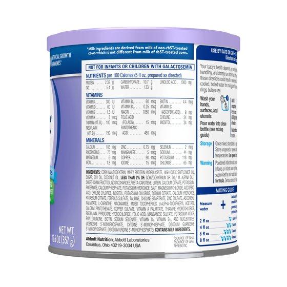 Corn Maltodextrin, Whey Protein Hydrolysate, High Oleic Safflower Oil, Sugar, Soy Oil, Coconut Oil; Less than 2% of: C. Cohni Oil, (a)M. Alpina Oil, (b)Shortchain Fructooligosaccharides, Beta-Carotene, Lutein, Calcium Citrate, Potassium Phosphate, Calcium Phosphate, Potassium Hydroxide, Salt, Magnesium Chloride, Ascorbic Acid, Choline Chloride, Inositol, Potassium Chloride, Sodium Citrate, Calcium Hydroxide, Potassium Citrate, Ferrous Sulfate, Taurine, Choline Bitartrate, Zinc Sulfate, Ascorbyl Palmitate, L-Carnitine, Nacinamide, Mixed Tocopherols, D-Alpha-Tocopheryl Acetate, Calcium Pantothenate, Copper Sulfate, Vitamin A Palmitate, Thiamine Hydrochloride, Riboflavin, Pyridoxine Hydrochloride, Folic Acid, Manganese Sulfate, Potassium Iodide, Phylloquinone, Biotin, Sodium Selenate, Vitamin D3, Vitamin B12, and Nucleotides (Adenosine 5'- Monophosphate, Cytidine 5 - Monophosphate, Disodium Guanosine 5-Monophosphate, Disodium Uridine 5 - Monophosphate). (a)Source of DHA. (b)Source of ARA.