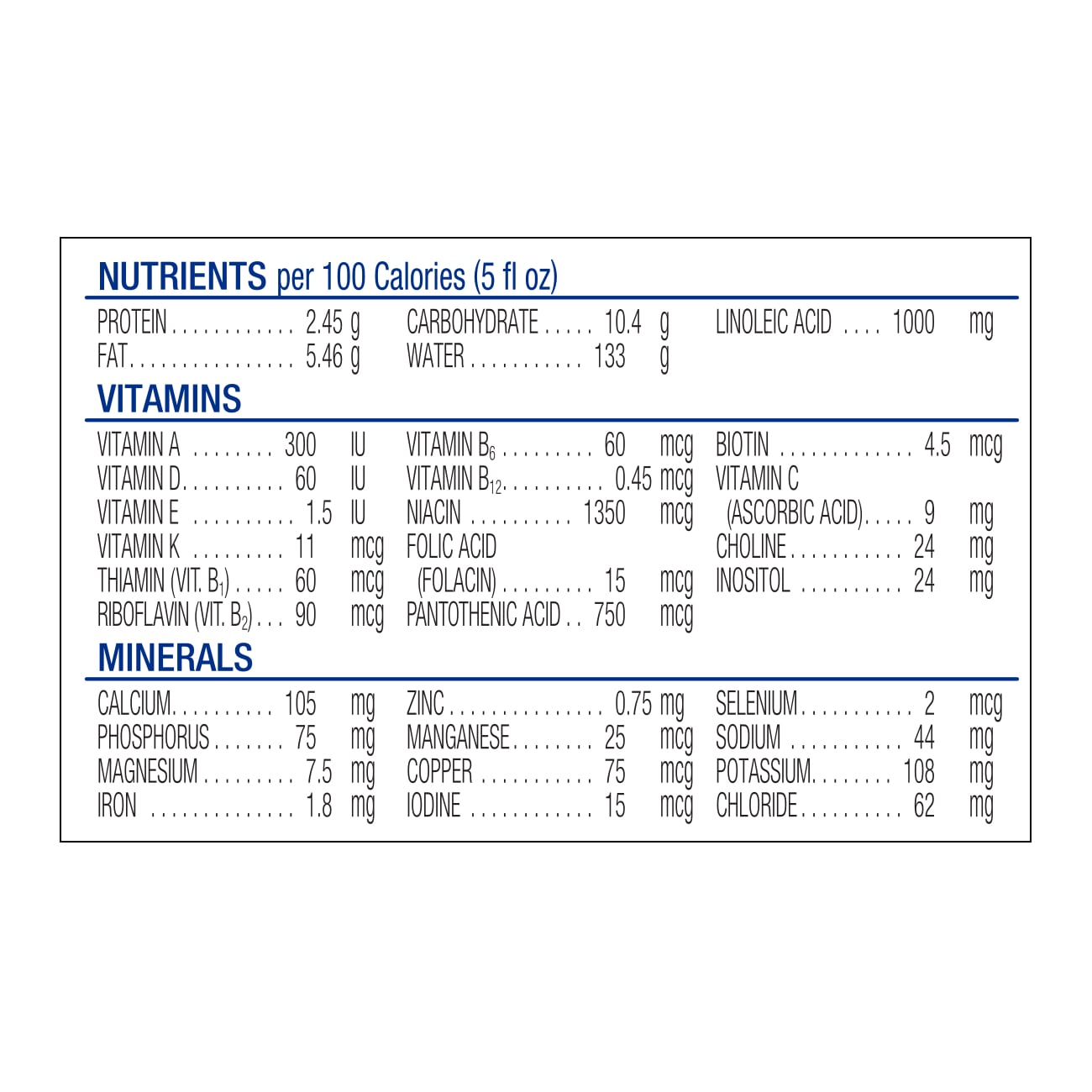 86% Water, 6.6% Corn Syrup, 1.9% Soy Protein Isolate, 1.4% High Oleic Safflower Oil, 1.3% Sugar (Sucrose), 1.1% Soy Oil, 1.0% Coconut Oil. Less than 0.5% of the Following: C. Cohnii Oil*, M. Alpina Oil , Calcium Citrate, Potassium Citrate, Calcium Phosphate, Potassium Phosphate, Potassium Chloride, Monoglycerides, Soy Lecithin, Magnesium Chloride, Carrageenan, Sodium Chloride, Ascorbic Acid, Choline Chloride, L-Methionine, Taurine, Ferrous Sulfate, m-Inositol, Zinc Sulfate, d-Alpha-Tocopheryl Acetate, L-Carnitine, Niacinamide, Calcium Pantothenate, Cupric Sulfate, Thiamine Chloride Hydrochloride, Beta-Carotene, Vitamin A Palmitate, Riboflavin, Pyridoxine Hydrochloride, Folic Acid, Potassium Iodide, Potassium Hydroxide, Phylloquinone, Biotin, Sodium Selenate, Vitamin D3, and Cyanocobalamin. * A source of docosahexaenoic acid (DHA). A source of arachidonic acid (ARA). Contains soy ingredients.