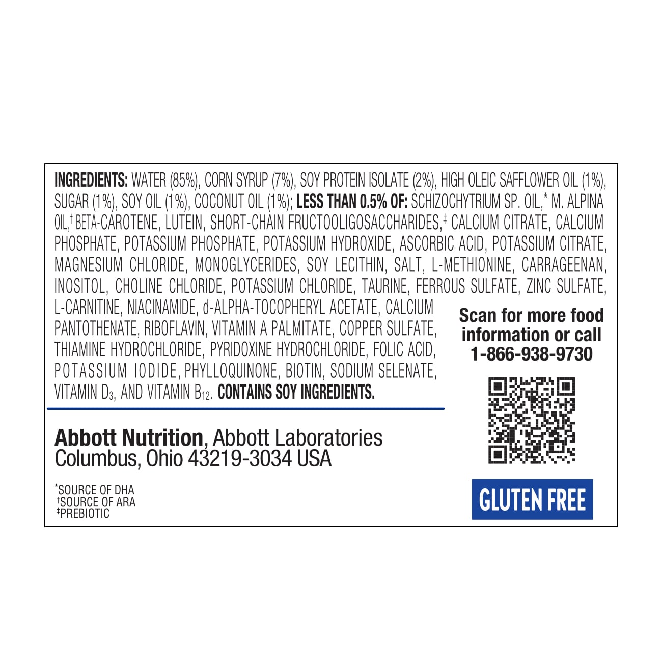 WATER (85%), CORN SYRUP (7%), SOY PROTEIN ISOLATE (2%), HIGH OLEIC SAFFLOWER OIL (1%), SUGAR (1%), SOY OIL (1%), COCONUT OIL (1%); LESS THAN 0.5% OF: SCHIZOCHYTRIUM SP. OIL*, M. ALPINA OIL†, BETA-CAROTENE, LUTEIN, SHORT-CHAIN FRUCTOOLIGOSACCHARIDES‡, CALCIUM CITRATE, CALCIUM PHOSPHATE, POTASSIUM PHOSPHATE, POTASSIUM HYDROXIDE, ASCORBIC ACID, POTASSIUM CITRATE, MAGNESIUM CHLORIDE, MONOGLYCERIDES, SOY LECITHIN, SALT, L-METHIONINE, CARRAGEENAN, INOSITOL, CHOLINE CHLORIDE, POTASSIUM CHLORIDE, TAURINE, FERROUS SULFATE, ZINC SULFATE, L-CARNITINE, NIACINAMIDE, d-ALPHA-TOCOPHERYL ACETATE, CALCIUM PANTOTHENATE, RIBOFLAVIN, VITAMIN A PALMITATE, COPPER SULFATE, THIAMINE HYDROCHLORIDE, PYRIDOXINE HYDROCHLORIDE, FOLIC ACID, POTASSIUM IODIDE, PHYLLOQUINONE, BIOTIN, SODIUM SELENATE, VITAMIN D3, AND VITAMIN B12. CONTAINS SOY INGREDIENTS.