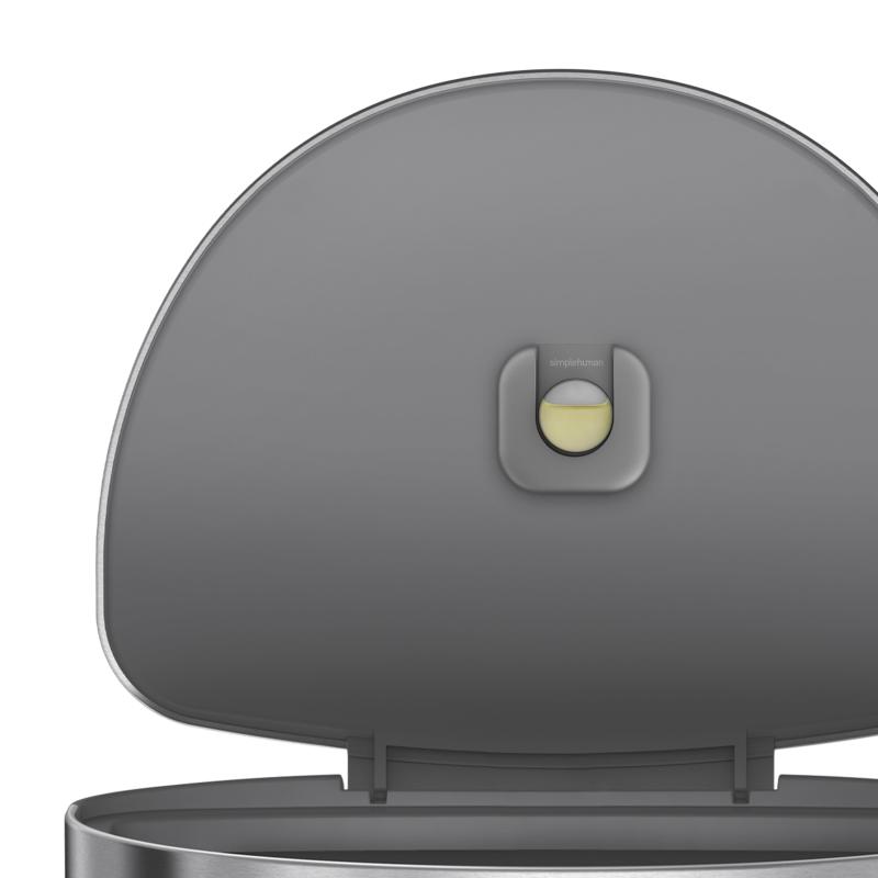 - Semi-round step can. Silent close lid - The simplehuman patented lid shox technology controls the motion of the lid for a slow, silent close. Includes an all natural odorsorb pod that fits discreetly under the lid of your simplehuman can to eliminate trash odors for 45 days.