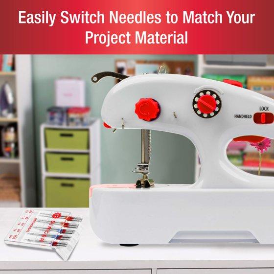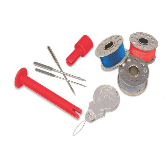 - Includes 2 pre-threaded bobbins, 2 machine needles, needle threader, a bobbin winding pin, and a long thread spool pin which can be neatly stored in the built-in storage compartment when not in use