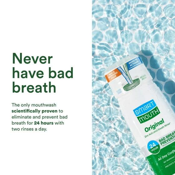 - NEVER HAVE BAD BREATH AGAIN - GUARANTEED - SmartMouth’s Original Activated bad breath mouthwash uses patented zinc ion technology to stop sulfur producing germs. This eliminates and blocks bad breath or halitosis for 12 hours with every rinse. At SmartMouth, we’re confident that each of our bad breath oral rinses will eliminate your bad breath, and that’s why each product carries a full money-back satisfaction guarantee.