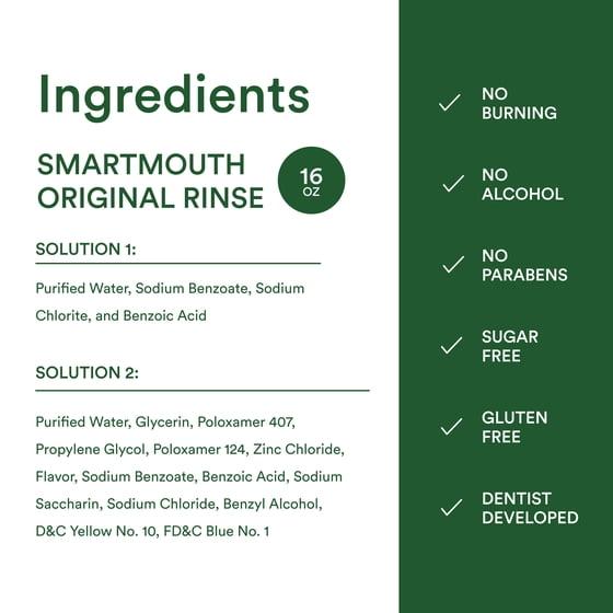 - ALCOHOL FREE – NO BURNING SENSATION - SmartMouth’s Original bad breath mouthwash uses zinc ions to eliminate and block bad breath or halitosis without any of the stinging or burning sensation. Alcohol dries out your mouth, making you more vulnerable to bad breath. SmartMouth’s bad breath treatment uses the power of zinc ions to eliminate and block bad breath for 24 hours with twice daily use.