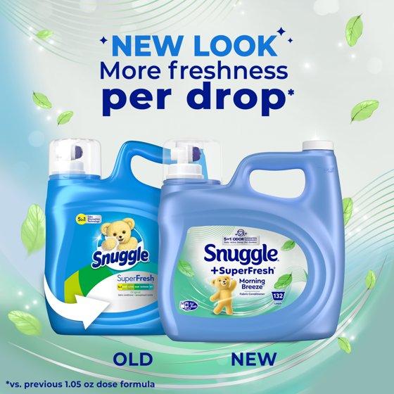 Bring the familiar comfort of home with you wherever you go, with Snuggle® SuperFresh® Morning Breeze Liquid Fabric Conditioner. Specially formulated with 5-in-1 Odor Eliminating Technology, this fabric softener removes hard-to-get-out odors, including body, active, damp, outdoor, and pet odors, at their source. Our SuperFresh® Morning Breeze scent delivers a powerful fresh scent of citrus with a blend of floral and fruity green notes that are followed by a base of amber and powdery musk€”all fusing together to create a comforting, long-lasting freshness.* See how Snuggle® SuperFresh® liquid fabric softener gives your family's laundry that little extra boost of softness, protection,** and long-lasting fragrance. That's the Snuggle Promise. Choose Snuggle® SuperFresh® and enjoy odor-eliminating technology and a delightful fresh scent. 117.9oz and 132 Loads *out of storage **Snuggle® Liquid Fabric Softener helps protect against color fading.