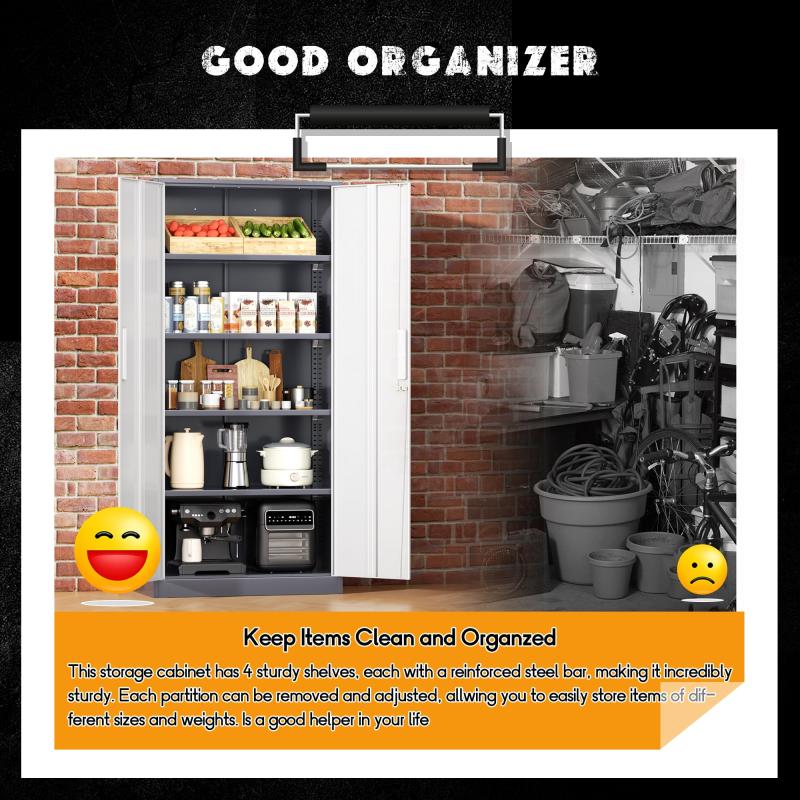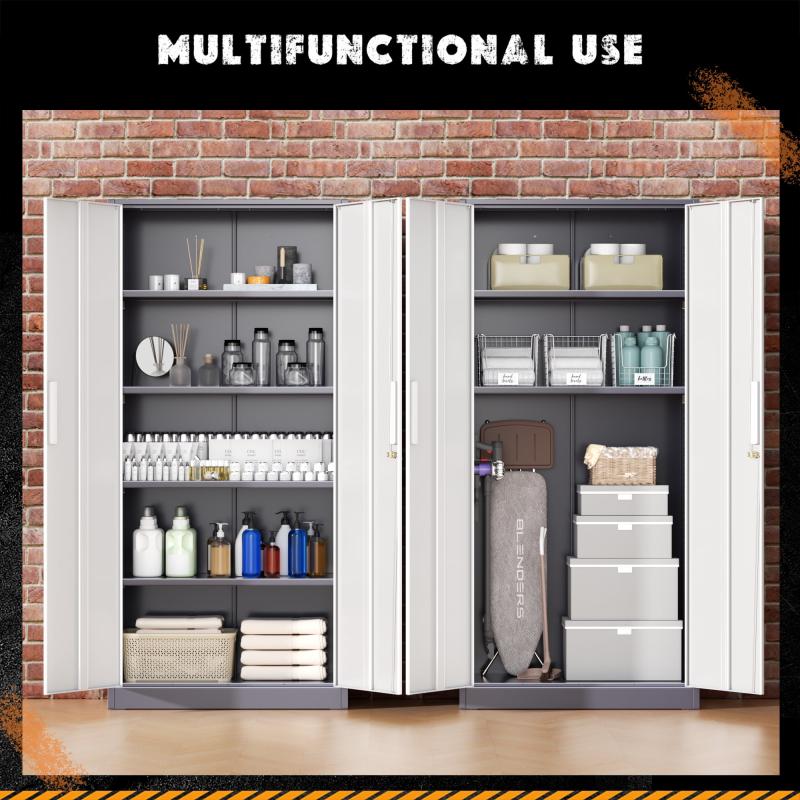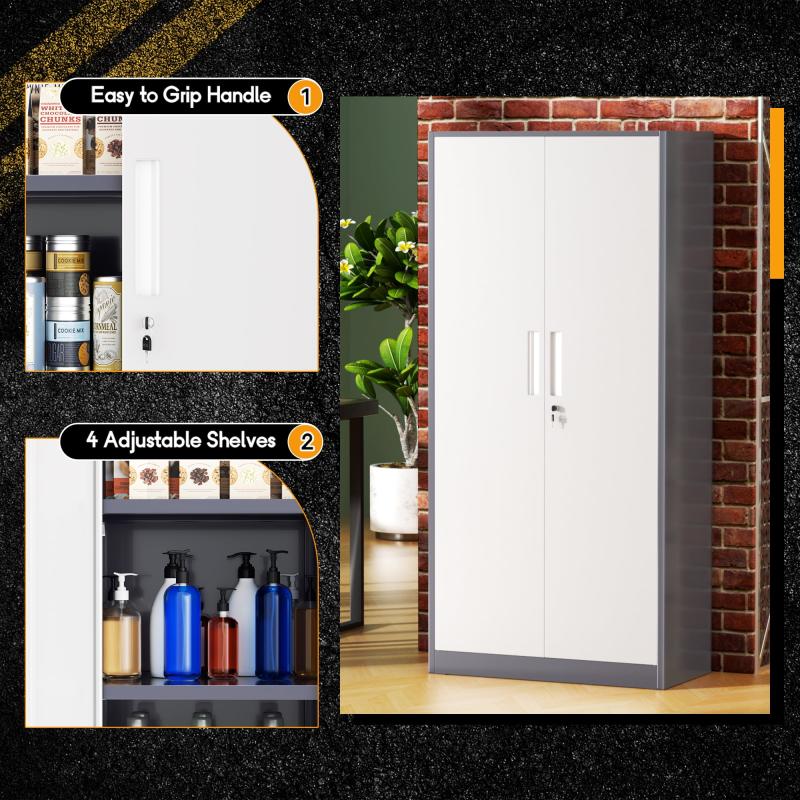 Our metal storage cabinet is made of high quality cold rolled steel plate, which is study and durable. The cabinet is perfect for office, home, kitchen, garage. Four shelves in this metal garage cabinet are adjustable, providing high adaptability and convenience. And the lockable design increases storage security, you could create a unique storage space according to your needs.