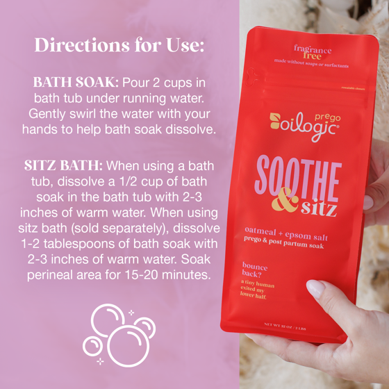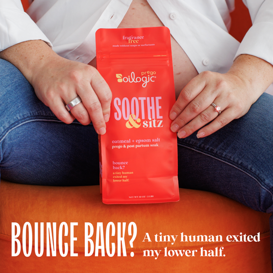Bounce back? A tiny human just exited my lower half. Oilogic Prego Solutions are there to help through the not-so-fun side of the pregnancy journey, so you can bask in that pregnancy "glow". Oilogic Prego Soothe & Sitz Soak is made for use during pregnancy and postpartum. The formula includes only two ingredients, Epsom Salt and Oatmeal, offering a clean yet effective solution for your body. To use as a bath soak, pour two cups in the bath under running water. Gently swirl the water with your hands to help bath soak dissolve. To use as a sitz bath in a bathtub, dissolve a 1/2 cup of the bath soak in the bathtub with 2-3 inches of warm water. To use a sitz bath, dissolve 1-2 tablespoons in sitz basin (sold separately) in 2-3 inches of warm water. Soak the perineal area for 15-20 minutes. Formula is Cruelty Free & Vegan and made without harsh ingredients including synthetic fragrance, sodium lauryl sulfate (SLS), parabens, petroleum, gluten, propylene glycol, phthalates, dyes, DEA and mineral oil. Oilogic is a women-owned, founded and lead brand.