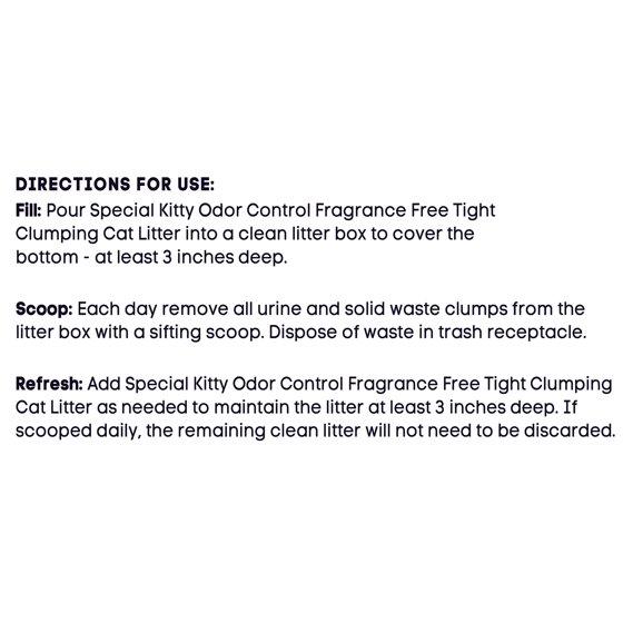 Special Kitty Fragrance Free Odor Control Tight Clumping Cat Litter takes care of the mess so you can enjoy more of the good moments with your cat. This unscented litter locks in odors for up to ten days, keeping your home feeling fresh without any added fragrance. The tight clumping formula makes cleanup quick and easy, forming solid clumps that don't break apart while scooping. Designed with 99% dust-free granules, it helps reduce tracking and keeps the air clearer around your litter area. Perfect for multi-cat households, it's dependable, simple to maintain, and gentle enough for sensitive cats. Keep things clean with Special Kitty Fragrance Free Odor Control Tight Clumping Cat Litter.