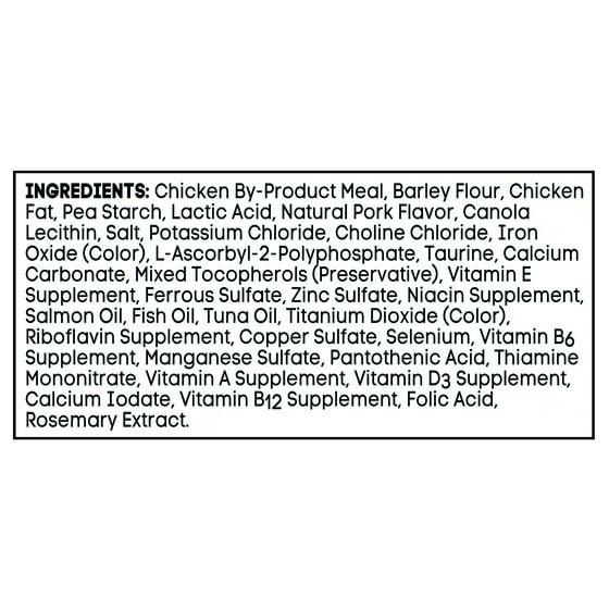 Chicken By-Product Meal, Barley, Tapioca, Rice Flour, Chicken Fat, Natural Flavors, Lecithin, Brewers Dried Yeast, Dried Whey, Salt, Pork Fat, Glucono-Delta-Lactone, Phosphoric Acid, Choline Chloride, Taurine, Mixed Tocopherols (Preservative), Sorbic Acid
