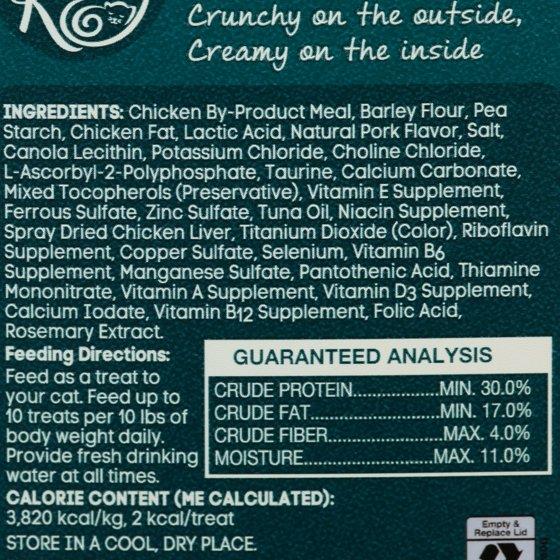 Chicken By-Product Meal, Barley Flour, Pea Starch, Chicken Fat, Lactic Acid, Natural Pork Flavor, Salt, Canola Lecithin, Potassium Chloride, Choline Chloride, L-Ascorbyl-2-Polyphosphate, Taurine, Calcium Carbonate, Mixed Tocopherols (Preservative), Vitamin E Supplement, Ferrous Sulfate, Zinc Sulfate, Tuna Oil, Niacin Supplement, Spray Dried Chicken Liver, Titanium Dioxide (Color), Riboflavin Supplement, Copper Sulfate, Pantothenic Acid, Thiamine Mononitrate, Vitamin A Supplement, Vitamin D3 Supplement, Calcium Iodate, Vitamin B12 Supplement, Folic Acid, Rosemary Extract