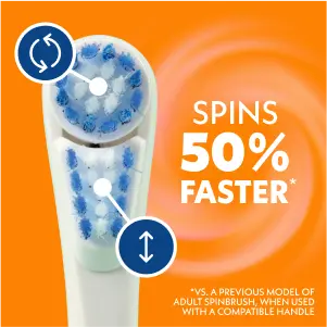 - Brush head spins 50% faster (than a previous model of adult Spinbrush) when used with a compatible Spinbrush handle