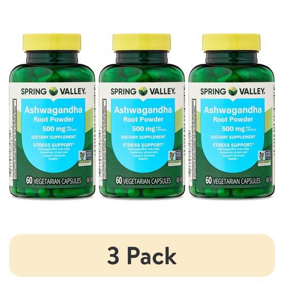 (3 pack) Spring Valley Ashwagandha Root Powder General Wellness Dietary Supplement Vegetarian Capsules, 500 mg, 60 Count