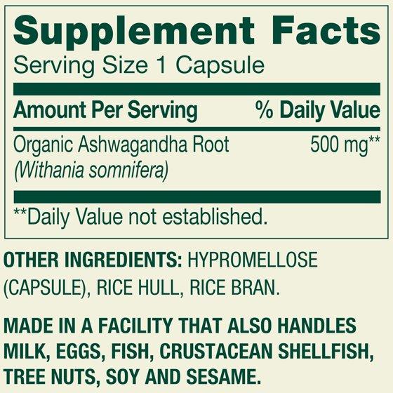 Ingredients: Organic Ashwagandha Root (Withania somnifera). Other Ingredients: Hypromellose (capsule), Rice Hulls, Rice Extract.
