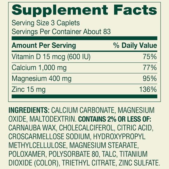 - 1000 mg of calcium, 400 mg of magnesium, 15 mg of zinc, and 15 mcg (600 IU) of vitamin D3 per serving