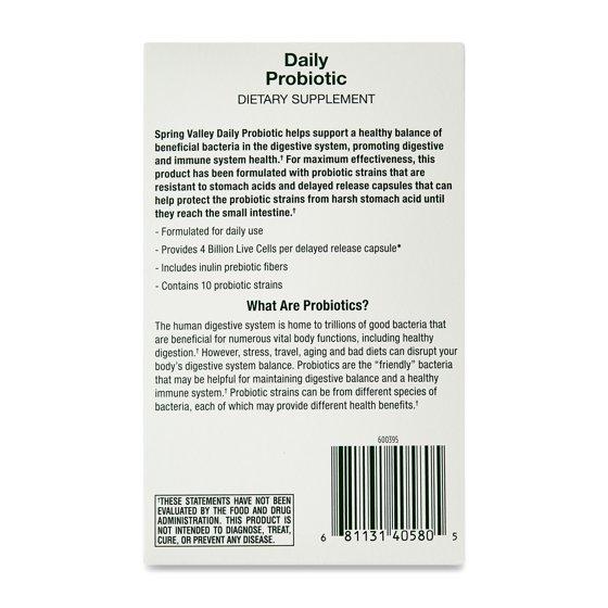 Spring Valley Spring Valley Daily Probiotic Delayed Release Capsules help support a healthy balance of beneficial bacteria in the digestive system, promoting digestive and immune system health.* Each vegetarian capsule delivers four billion live cells across 10 diverse probiotic strains, helping to promote a balanced gut and overall wellness.* Formulated for daily use, this supplement also includes prebiotic fiber to nourish beneficial bacteria and encourage long-term digestive support.* For maximum effectiveness, this product has been formulated with delayed release tablets that can help protect the probiotic strains from that harsh stomach acid until they reach the small intestine.* Protect your digestive health with Spring Valley Daily Probiotic Delayed-Release Capsules.