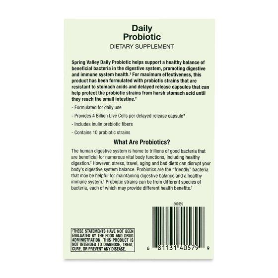 Spring Valley Spring Valley Daily Probiotic Delayed Release Capsules help support a healthy balance of beneficial bacteria in the digestive system, promoting digestive and immune system health.* Each vegetarian capsule delivers four billion live cells across 10 diverse probiotic strains, helping to promote a balanced gut and overall wellness.* Formulated for daily use, this supplement also includes prebiotic fiber to nourish beneficial bacteria and encourage long-term digestive support.* For maximum effectiveness, this product has been formulated with delayed release tablets that can help protect the probiotic strains from that harsh stomach acid until they reach the small intestine.* Protect your digestive health with Spring Valley Daily Probiotic Delayed-Release Capsules.
