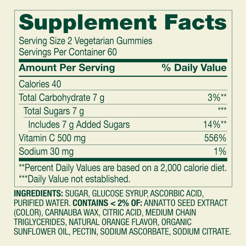 Sugar, Glucose Syrup, Ascorbic Acid, Purified Water. Contains < 2% of: Annatto Seed Extract (Color), Carnauba Wax, Citric Acid, Medium Chain Triglycerides, Natural Orange Flavor, Organic Sunflower Oil, Pectin, Sodium Ascorbate, Sodium Citrate.