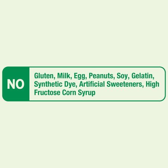 - No gluten, yeast, milk, artificial flavors or added preservatives, soy, artificial sweeteners, corn syrup, synthetic dyes, gelatin, or peanuts