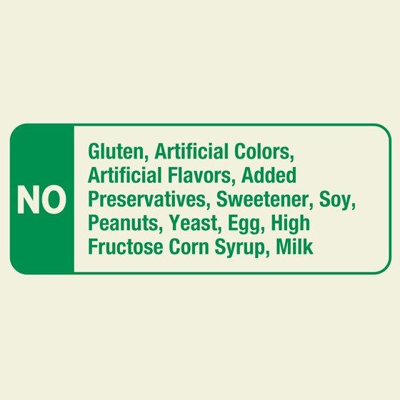 - No gluten, artificial flavors, artificial sweeteners, corn syrup, peanuts, milk, soy, synthetic dyes, or gelatin