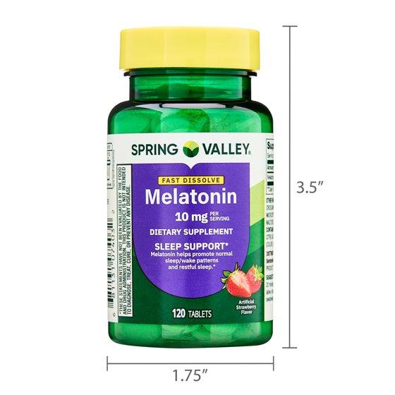 Rest easy with our Spring Valley Melatonin Sleep Health Dietary Supplement Tablets.* Melatonin helps to regulate sleep and wake cycles and may support more restful sleep.* Just one serving size per day delivers ten milligrams of melatonin, which is a naturally occurring compound that is produced by the body and has been associated with normal body rhythms and sleep/wake patterns.* The suggested adult serving is one tablet, 20 minutes before bedtime. These dietary supplements contain no gluten, wheat, milk, eggs, fish, crustacean shellfish, tree nuts, peanuts, soybeans, or yeast. They are 100 percent vegetarian and are free of artificial colors.