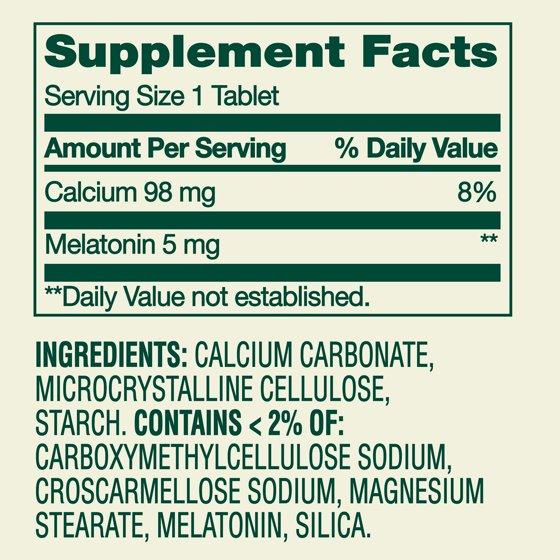 Calcium Carbonate, Microcrystalline Cellulose, Starch. Contains 2% or less of: Carboxymethylcellulose Sodium, Magnesium Stearate, Melatonin, Silicon Dioxide. May contain: Maltodextrin.