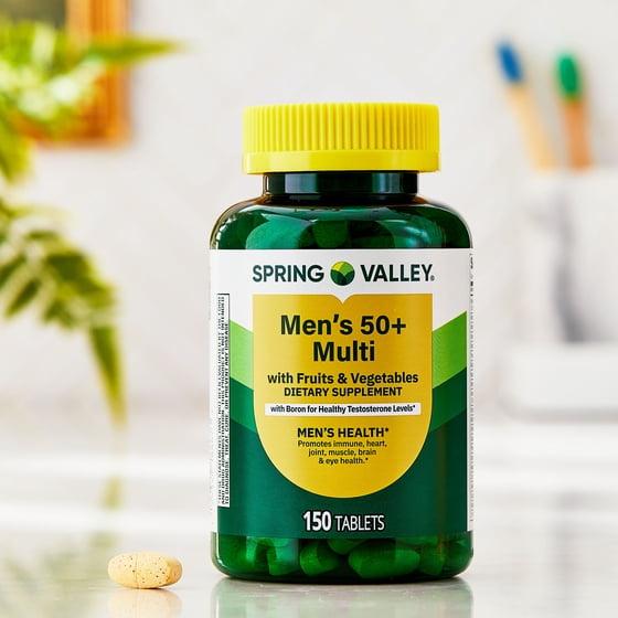 Our Spring Valley Men's 50+ Multi Tablets with Fruits & Vegetables Dietary Supplement is formulated to support the specific nutritional needs of men over 50.* This multivitamin is specially formulated with key nutrients to support their immune, heart, joint, muscle, brain, and eye health as well as aid cellular energy metabolism* — all in one convenient tablet. Additionally, it contains boron for healthy testosterone levels.* This formula also features a blend of 19 fruits and vegetables, including spinach, carrot, beet, strawberry, blueberry, apple, mango, grapefruit, and pineapple. These tablets contain no artificial colors or flavors, and are free of gluten, lactose, high fructose corn syrup, and artificial sweeteners. For best results, simply take one tablet daily with food as a dietary supplement. You can rest assured that Spring Valley Men's 50+ Multi Tablets with Fruits & Vegetables Dietary Supplement is produced with strict quality guidelines and is backed by our quality guarantee.