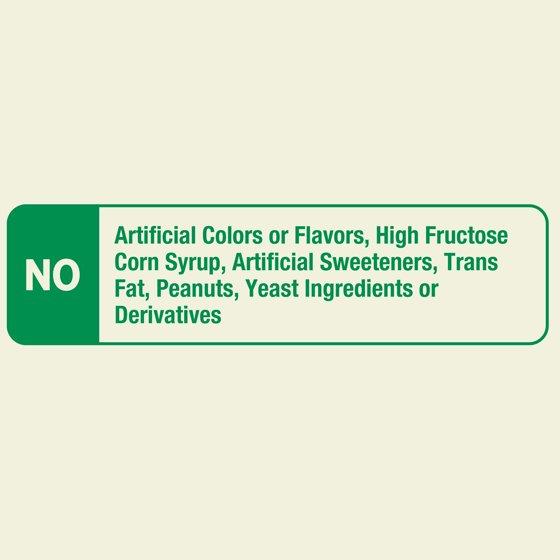 - No gluten, artificial colors or flavors, lactose, high fructose corn syrup, artificial sweeteners, eggs, milk or milk derivatives, soy, fish, shellfish, trans fat, peanuts, wheat, and yeast ingredients or derivatives