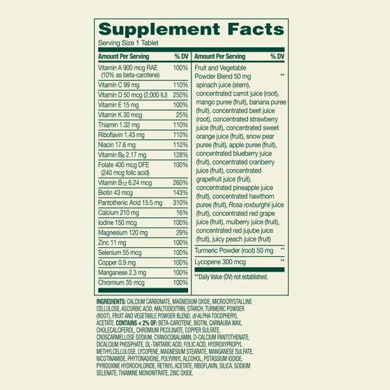 Calcium Carbonate, Magnesium Oxide, Microcrystalline Cellulose, Ascorbic Acid, Maltodextrin, Starch, Turmeric Powder (root), Fruit and Vegetable Powder Blend, dl-Alpha Tocopheryl Acetate. Contains < 2% of beta-carotene, biotin, cholecalciferol, chromium picolinate, copper sulfate, croscarmellose sodium, cyanocobalamin, D-calcium pantothenate, dicalcium phosphate, DL-tartaric acid, folic acid, hydroxypropyl methylcellulose, lycopene, magnesium stearate, manganese sulfate, nicotinamide, phytonadione, polyvinyl alcohol, potassium iodide, pyridoxine hydrochloride, retinyl acetate, riboflavin, silica, sodium selenate, thiamine mononitrate, zinc oxide.