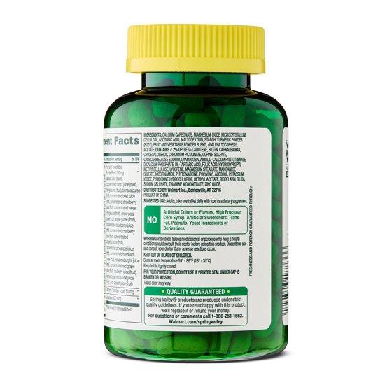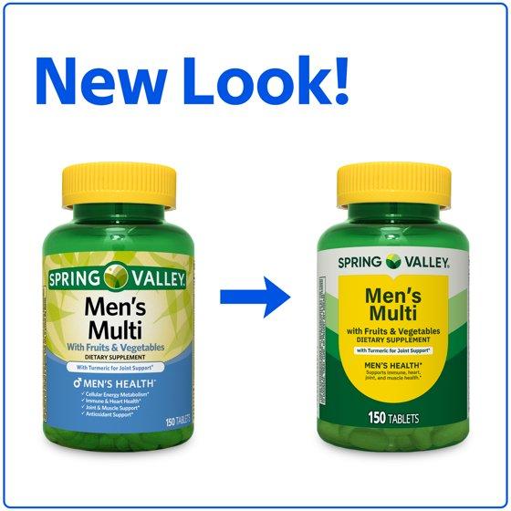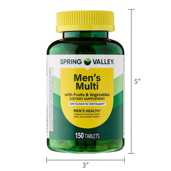 Our Spring Valley Men's Multi Tablets with Fruits & Vegetables Dietary Supplement is a comprehensive solution to help support men's health.* This multivitamin is specially formulated with key nutrients to help men support their immune, heart, and muscle health, provide antioxidant support, and aid in cellular energy metabolism*— all in one convenient tablet. Additionally, it contains turmeric to support joint health.* This formula also features a blend of 19 fruits and vegetables, including spinach, carrot, beet, strawberry, blueberry, apple, mango, grapefruit, and pineapple. These tablets contain no artificial colors or flavors, and are free of gluten, lactose, high fructose corn syrup, and artificial sweeteners. For best results, simply take one tablet daily with food as a dietary supplement. You can rest assured that Spring Valley Men's Multi Tablets with Fruits & Vegetables Dietary Supplement is produced with strict quality guidelines and is backed by our quality guarantee.